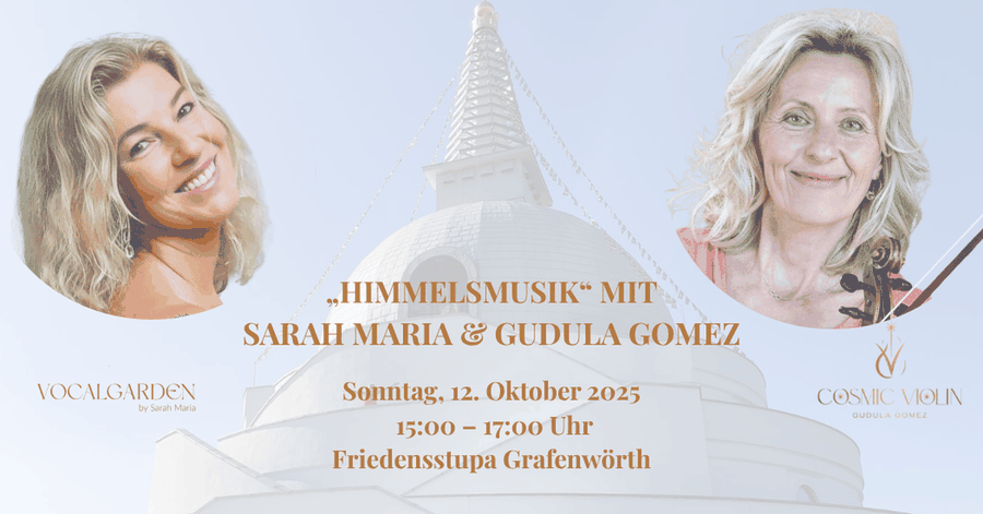 Im heiligen Raum des Friedensstupa Grafenwörth erklingen am 12. Oktober himmlische Klänge – getragen von der außergewöhnlichen Akustik dieses spirituellen Ortes. Die Musikerinnen Sarah Maria (Vocalgarden) und Gudula Gomez (Cosmic Violin) laden zu einem Konzert der besonderen Art ein: meditativ, heilsam, berührend und verbindend.